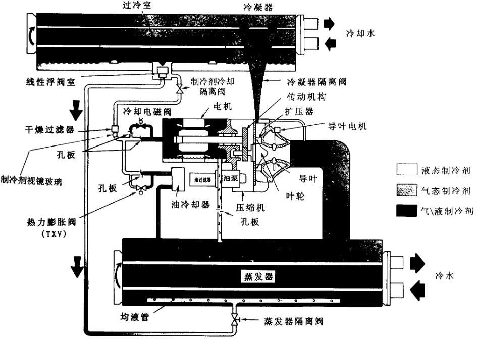 电机/润滑油冷却循环电机与润滑油的冷却系统依赖于冷凝器筒体底部的过冷液态制冷剂实现循环降温。在压缩机持续运转状态下,系统内部维持恒定压差,为制冷剂提供持续流动的驱动力。制冷剂依次通过隔离阀、精密过滤器及视镜式湿度监测装置后,在分液管处形成两路分流,分别注入电机冷却回路与润滑油冷却回路。