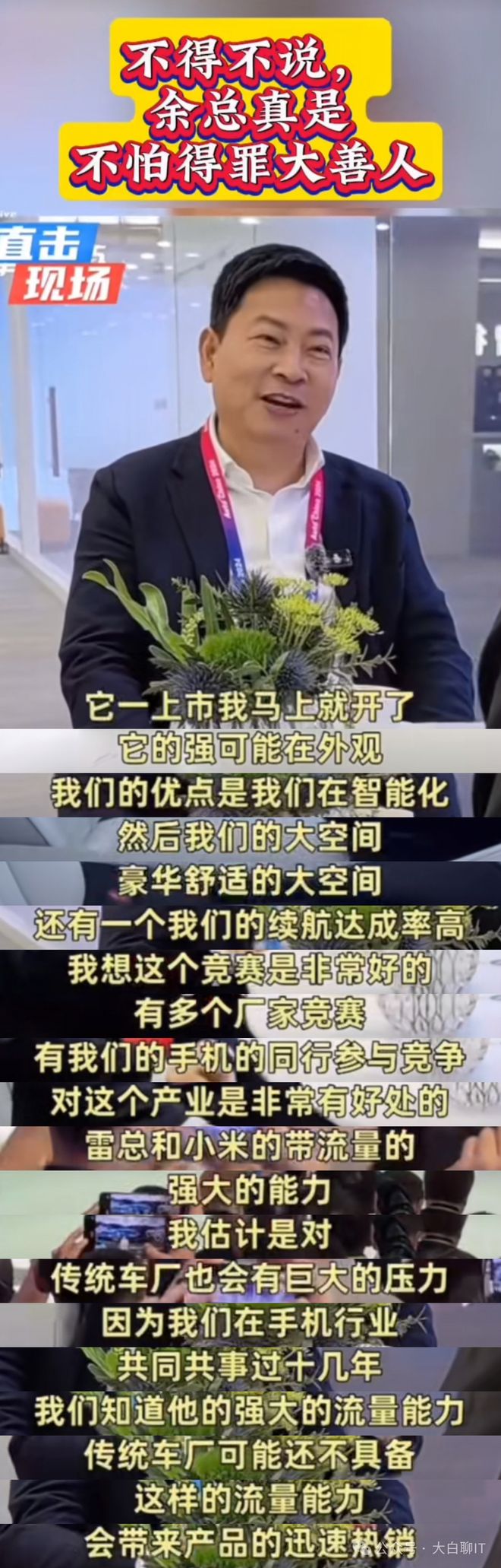 它一上市我马上就开了,它的强可能在外观,我们的优点是我们在智能化,然后我们的大空间,豪华舒适的大空间,还有一个我们的续航达成率高,我想这个竞赛是非常好的,有多个厂家竞赛,有我们的手机的同行参与竞争,对这个产业是非常有好处的,雷总和小米的带流量的,强大的能力,我估计是对传统车厂也会有巨大的压力,因为我们在手机行业共同共事过十几年,我们知道他的强大的流量能力,传统车厂可能还不具备这样的流量能力。
